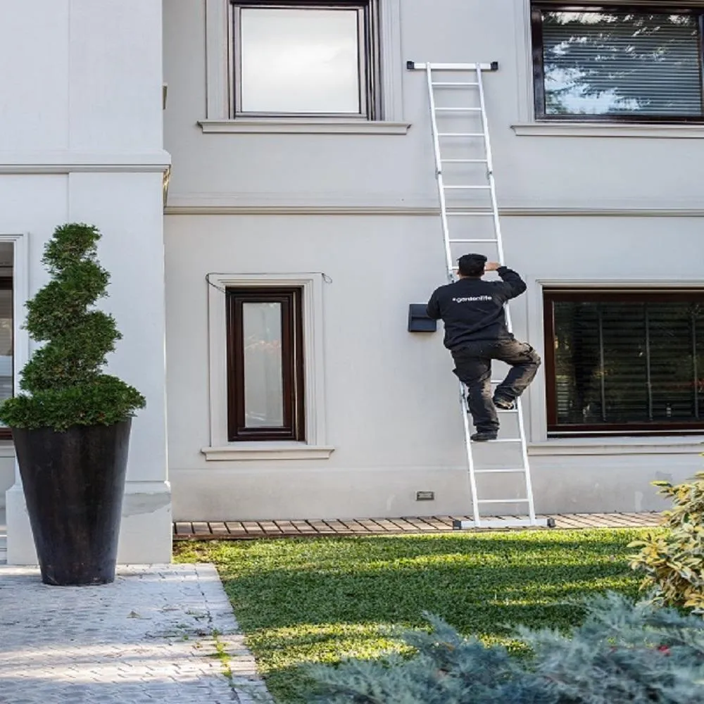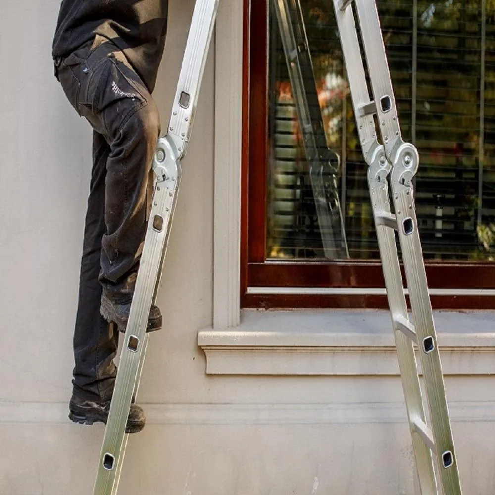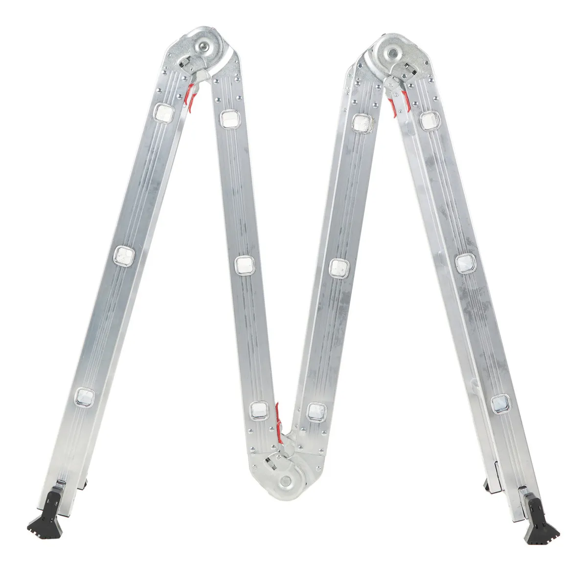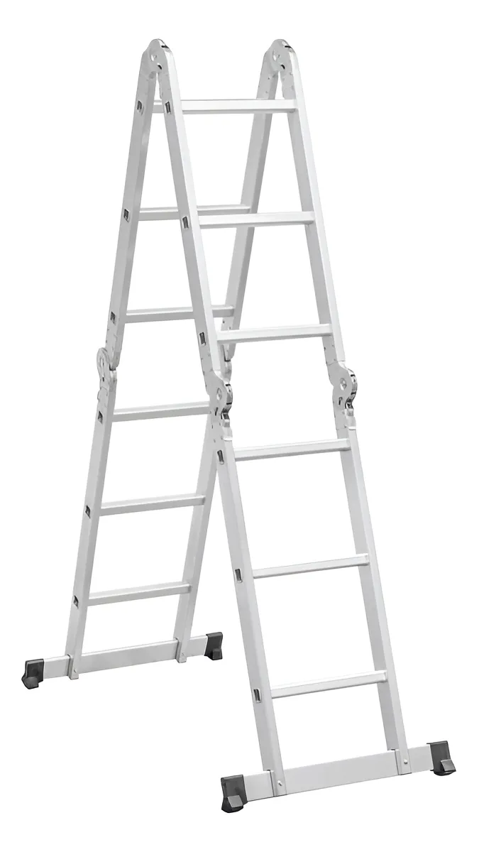 A escada multiuso é fabricada em alumínio de alta qualidade, estrutura compacta, fácil de transportar, com capacidade para suportar até 150 kg, resistente à corrosão, pés de borracha que não deslizam e proporcionam mais estabilidade e segurança, dobradiças de aço e travas de segurança.