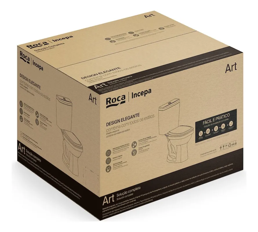 O kit de vaso sanitário com caixa acoplada Art da Roca | Incepa inclui todos os produtos necessários para instalação. Em uma única embalagem, você adquire a bacia para caixa, a caixa para acoplar com duplo acionamento 3/6 Litros, que promove a economia de água, o assento original em polipropileno (PP), um anel de vedação, fixação e um flexível plástico de 400mm. Além disso, você conta com garantias de 10 anos nas louças sanitárias, 1 ano no assento e 1 ano nos itens de instalação.