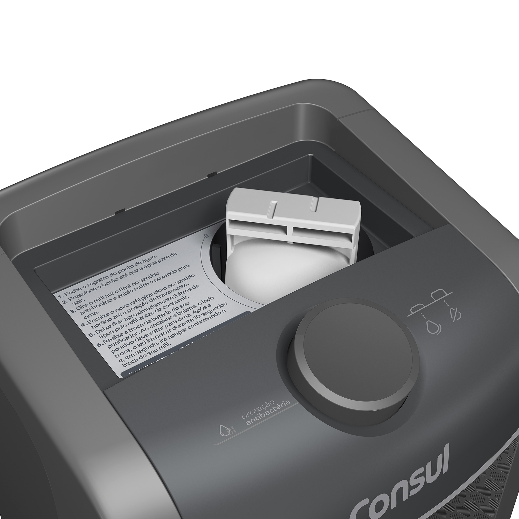 Basta girar o refil e substituí-lo por um novo, garantindo uma manutenção simples do seu purificador